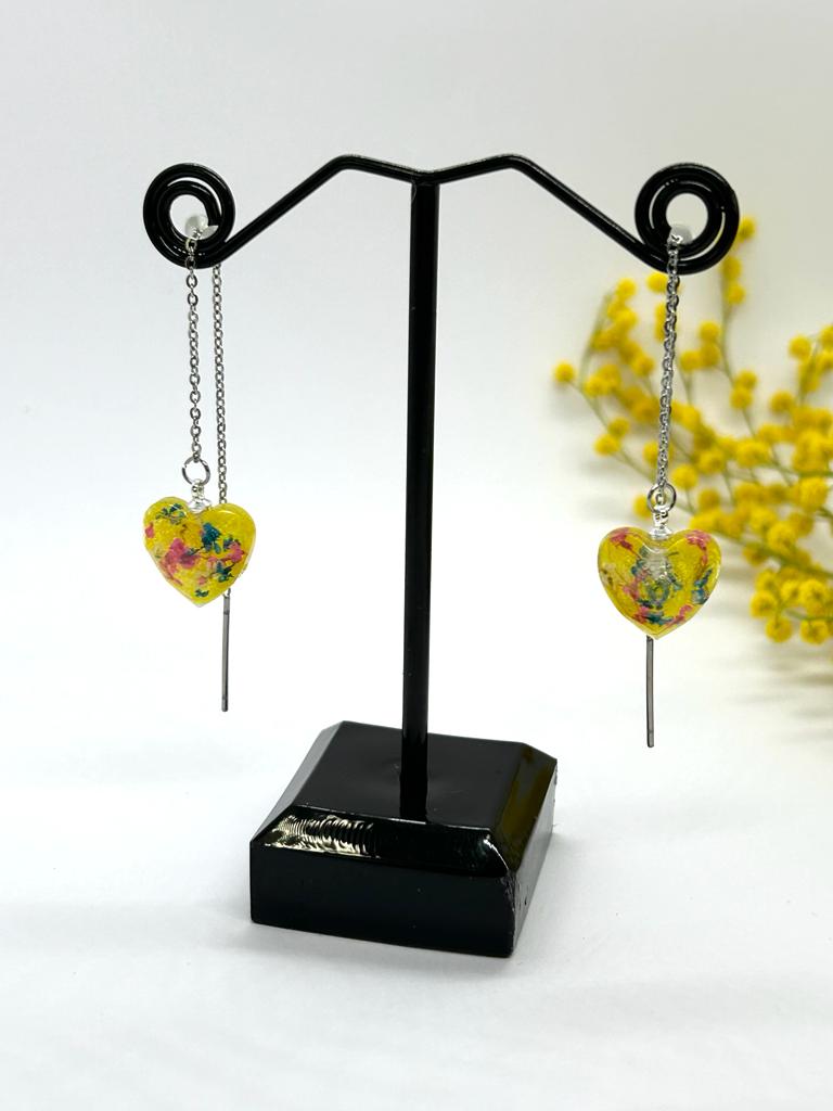 Petites cœurs jaune en résine remplis de fleurs colorées, suspendus a une fine chaîne en acier inoxydable. Légers, fins, agréables a porter, ils apportent une touche de nature douce et lumineuse a votre tenue.