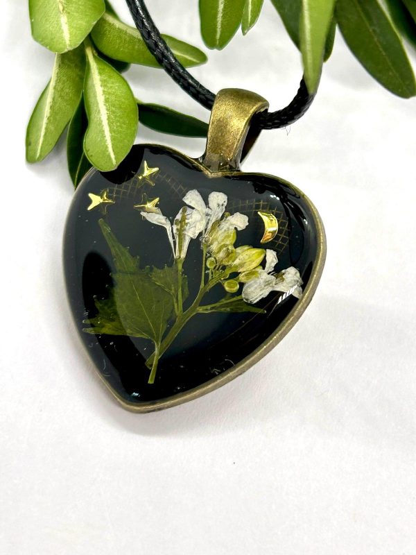 Collier au style naturel et raffiné, avec de délicates fleurs sauvages mises en valeur sur un fond noir profond. Monté sur un cordon en cuir noir, il crée un contraste saisissant qui attire le regarde tout en restant sobre et élégant.